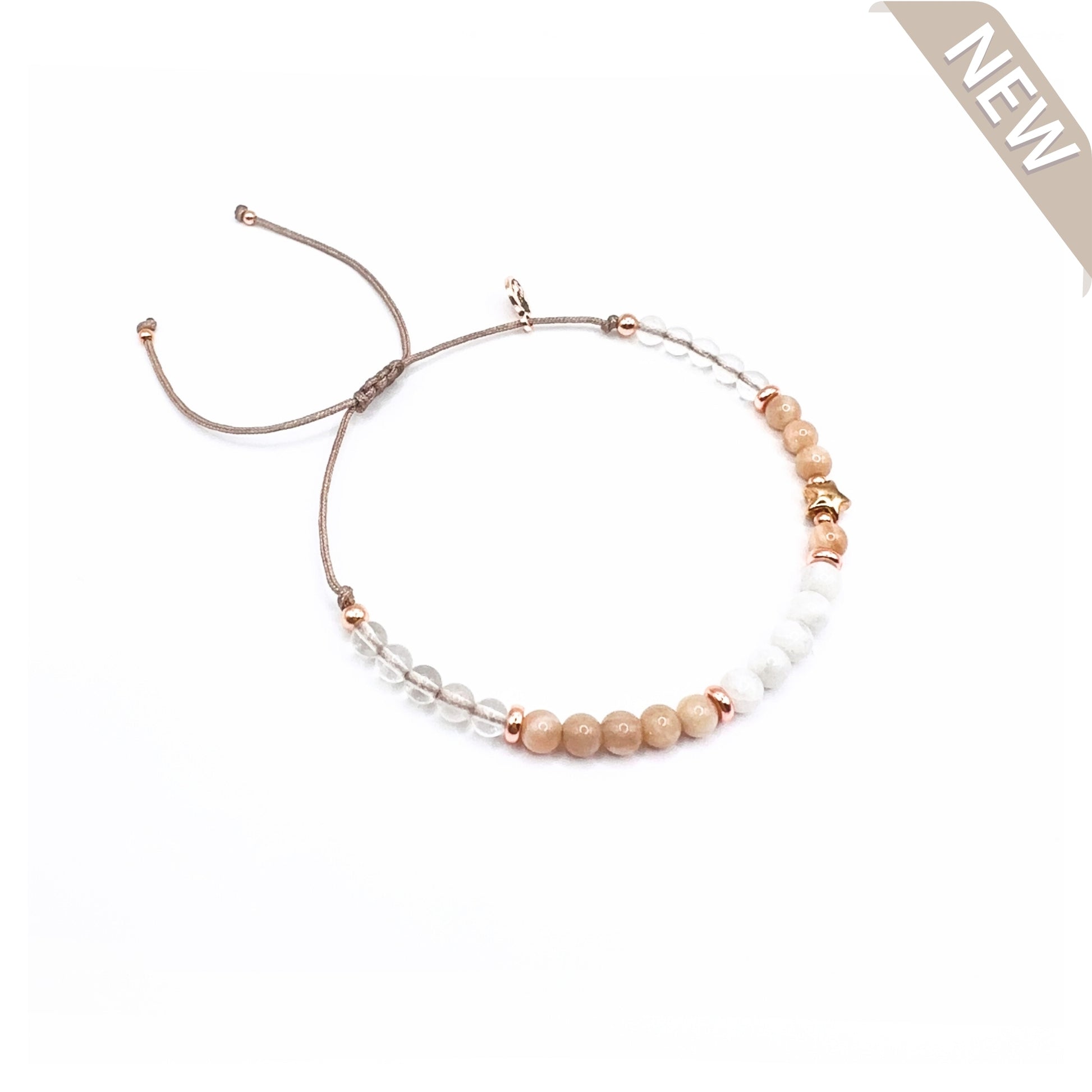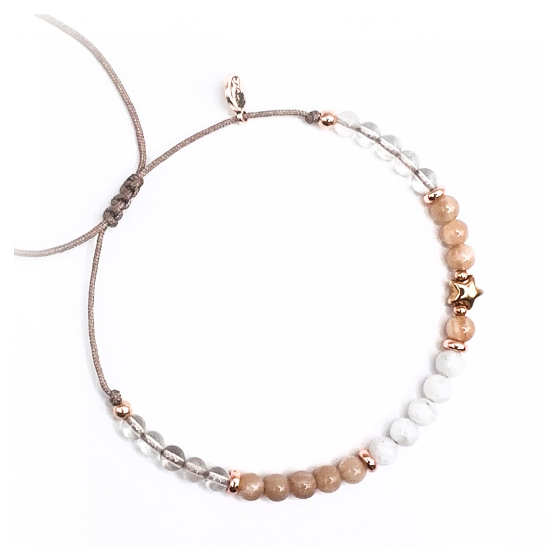 „A KISS GOODNIGHT“ – Sternenkindarmband in Roségold oder Gold mit Weißem Achat, Pfirsich-Mondstein & Bergkristall